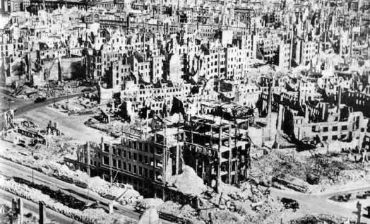 Ruinas de Dresde (1945). Las dos guerras mundiales fueron consecuencia directa de los planteamientos ‘modernos’. Imagen: Héroe en un mundo de titanes.
